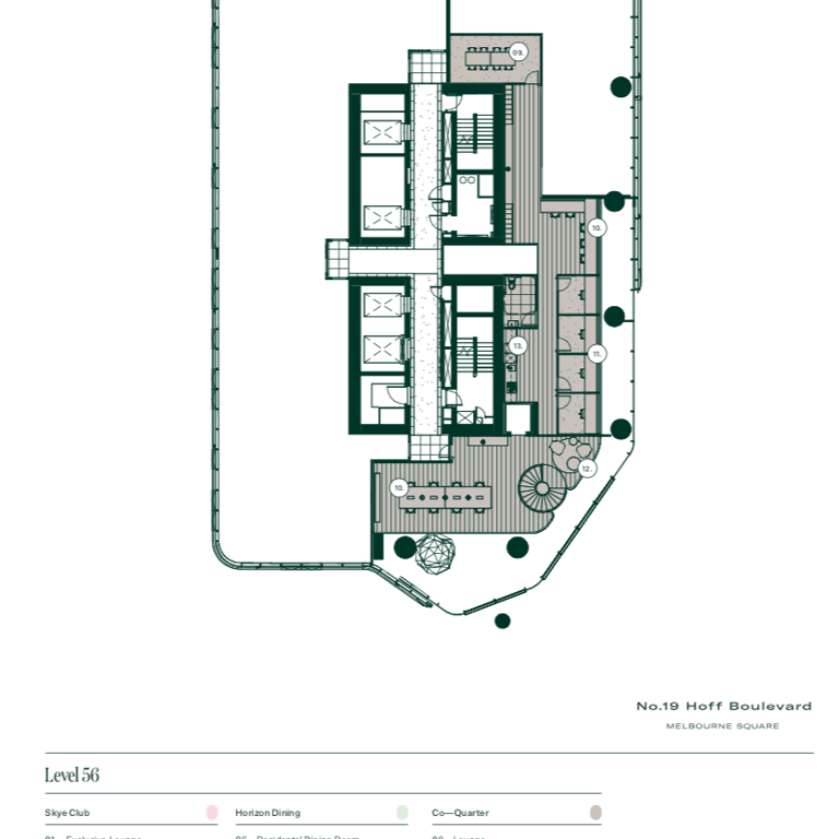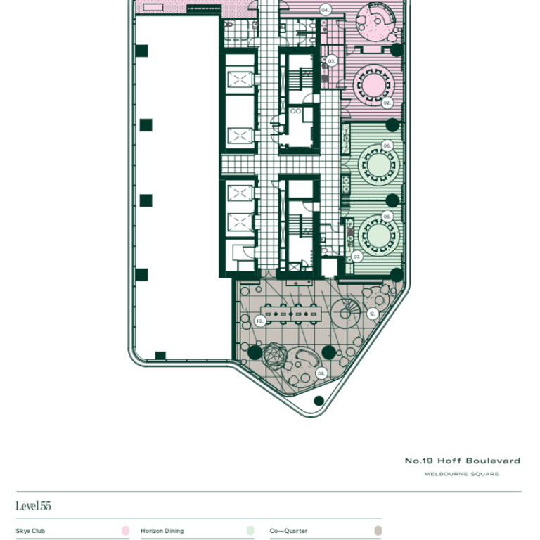 Offering commanding vistas that stretch across Melbourne's city skyline and beyond, the exclusive amenity spaces found on level 54 at Melbourne Square elevate both professional and lifestyle aspirations, providing an indulgent haven for unwinding amidst impeccable surroundings.